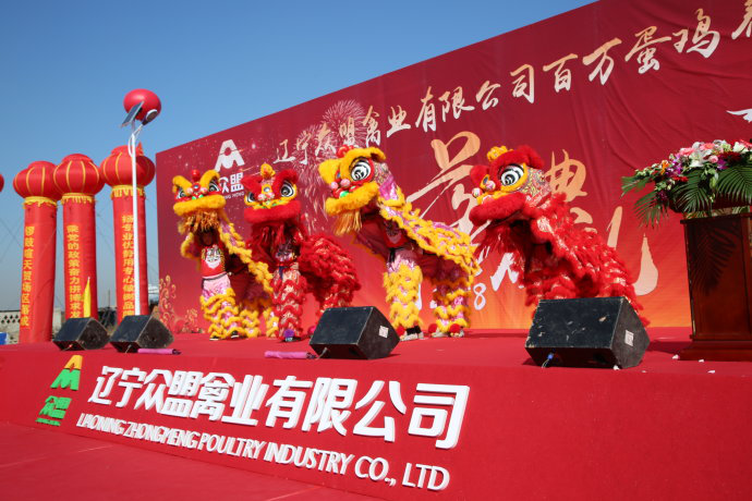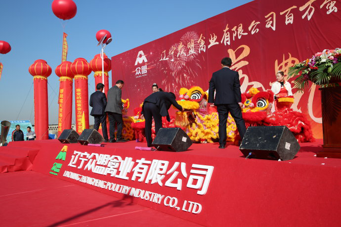伴随着振奋的锣鼓,热闹的舞狮登场,众友集团董事长张爱军、北京华都峪口禽业有限公司董事长孙皓、新民市副市级领导刘正、辽宁众盟禽业有限公司总经理孙公思为狮子醒狮点睛。