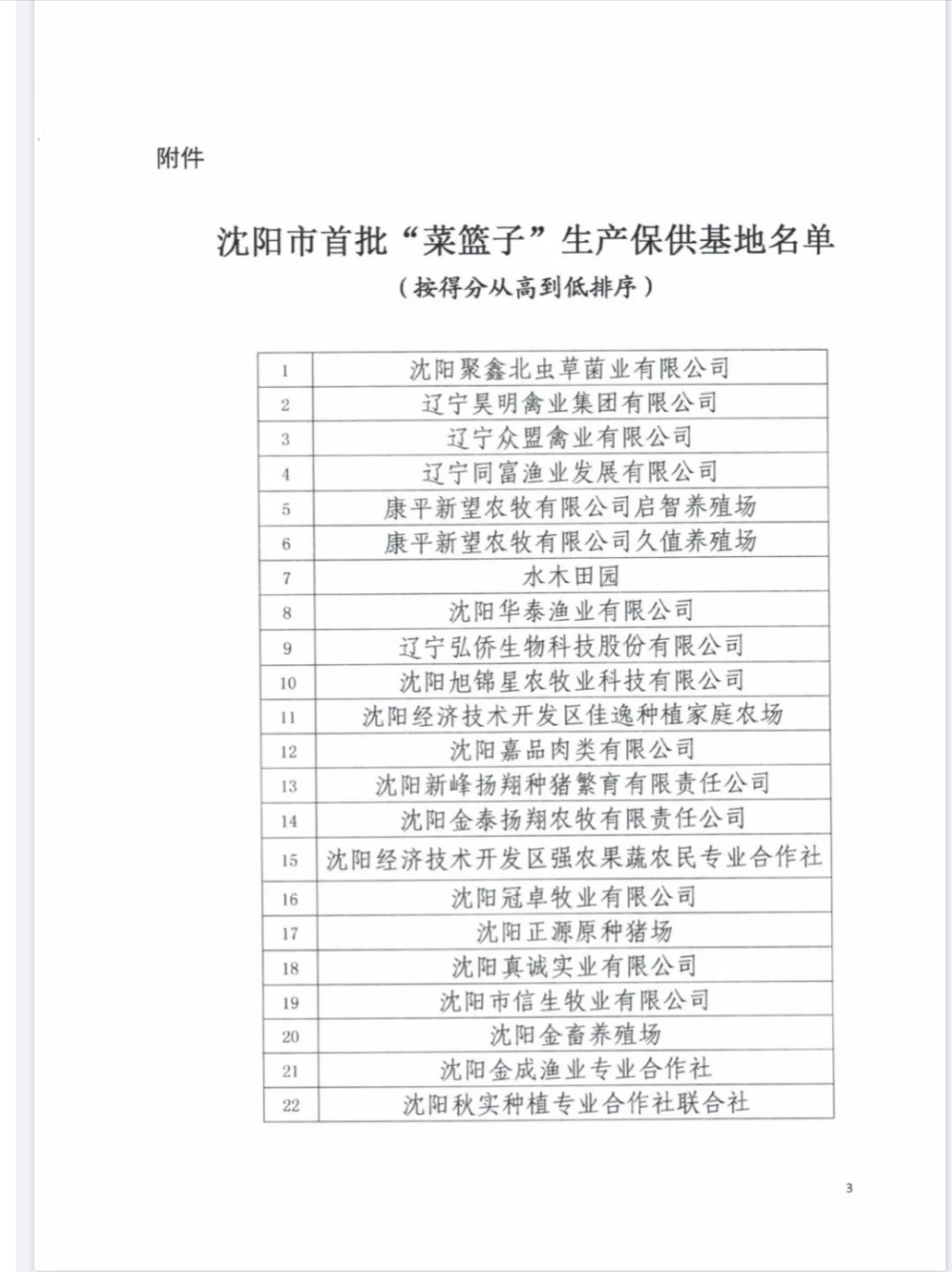 沈阳首批“菜篮子”生产保供基地通报,众盟禽业排名第三